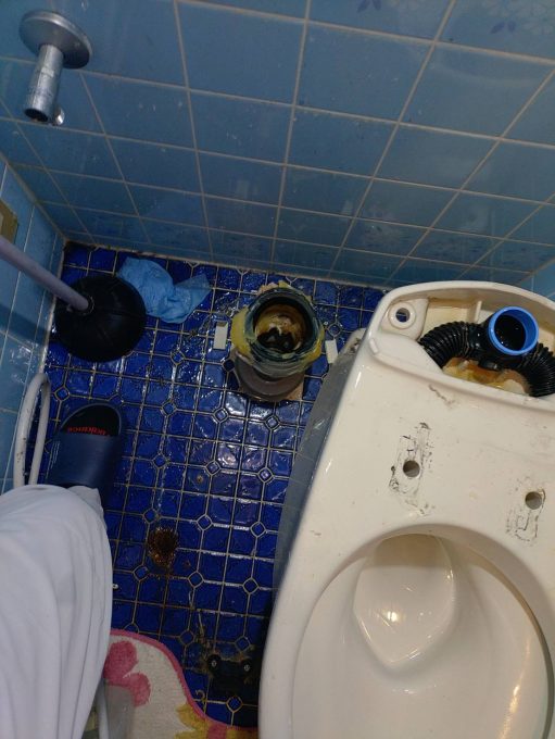 水の流れが悪く、手が届かない奥の排水口に詰まっていると判断し、トイレ脱着作業を提案させていただきました。